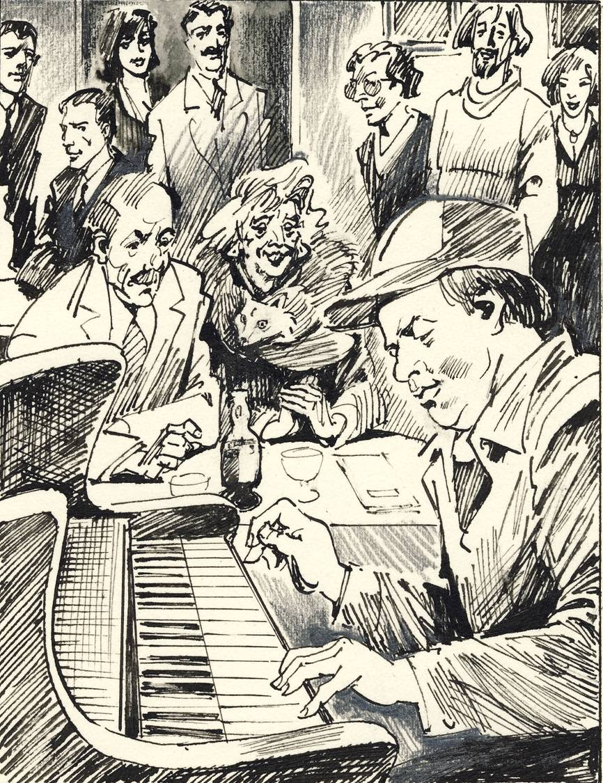 Вечер в самом разгаре, Игорь играет соло, и в этот момент в зал входят четыре человека, сразу обращающие на себя внимание своей смешной необычностью. Первыми входят мужчина и женщина, а за ними два крепких молодых парня. Она — совсем невысокого роста, слегка колченогая, на голове плод химической фантазии провинциального парикмахера, на лице выделяется краснющий рот, а глаза так заштукатурены тушью, что с расстояния и не разберешься — есть ли они вообще. Одета дама не стильно, но во все дорогое, это сразу видно. На плечах ее жалким, измученным трупом покоится какое-то животное. Мужчина, судя по всему, ее супруг ростом значительно выше, примерно на полторы головы. Лоб его сильно изморщен и от этого, да еще из-за большой лысины, кажется, что лицо у него приплюснуто. Посередине сдеформированной физиономии, аккурат под носом, растет кустик усов и в целом его портрет напоминает счетовода Вотрубу из знаменитого кабачка «13 стульев». Одет Вотруба опрятно, в добротный, несомненно, дорогой костюм и при цветастом галстуке.