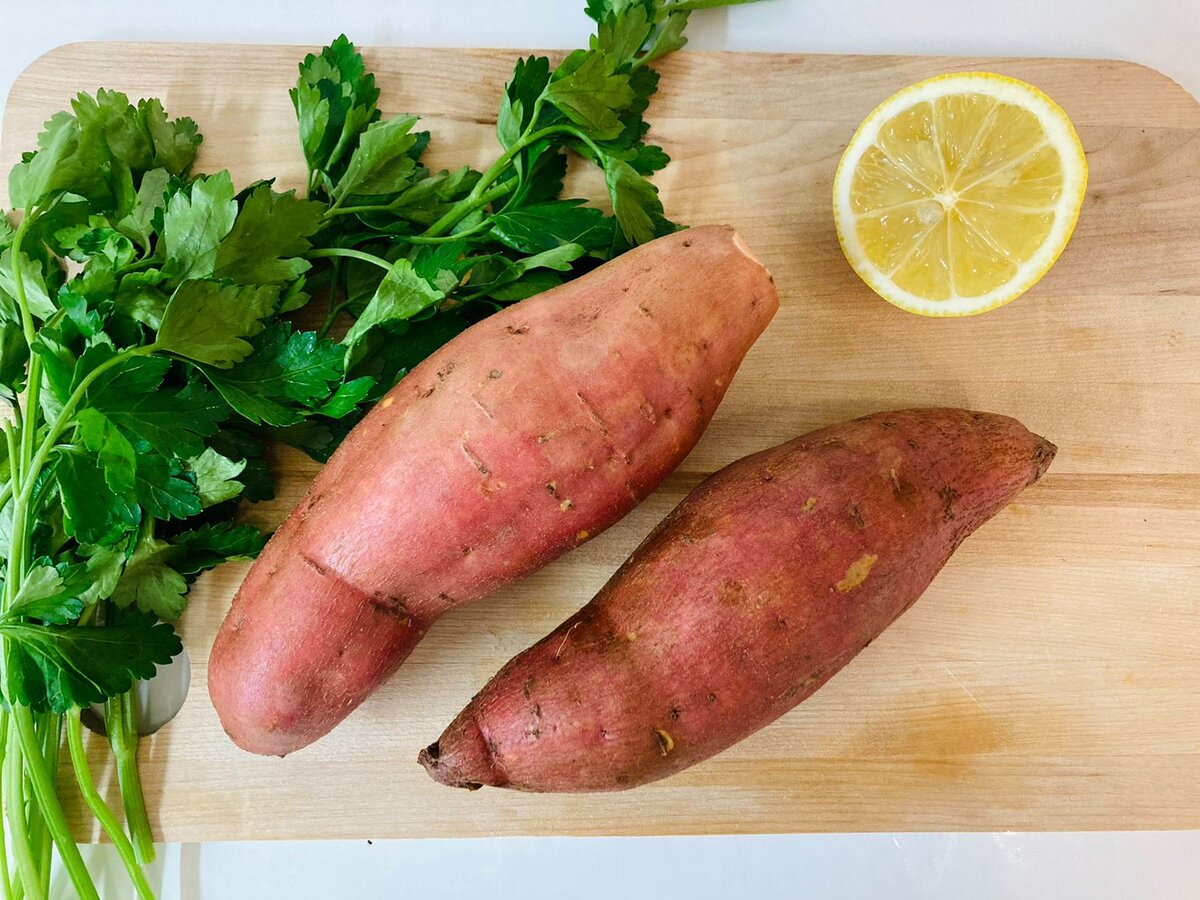 Ингредиенты: Для соуса Приготовление: Шаг 1. Очистить батат от кожуры и нарезать на небольшие брусочки. Шаг 2. Нарезанный батат посыпаем специями , добавляем масло и все перемешиваем. Шаг 3. Выкладываем на противень застеленный пергаментной бумагой. Отправляем в разогретую духовку 200° на 30 мин . Пока батат запекается приготовим соус. Шаг 4 . Запечённый батат выкладываем на тарелку и подаем вместе с соусом. Приятного аппетита!