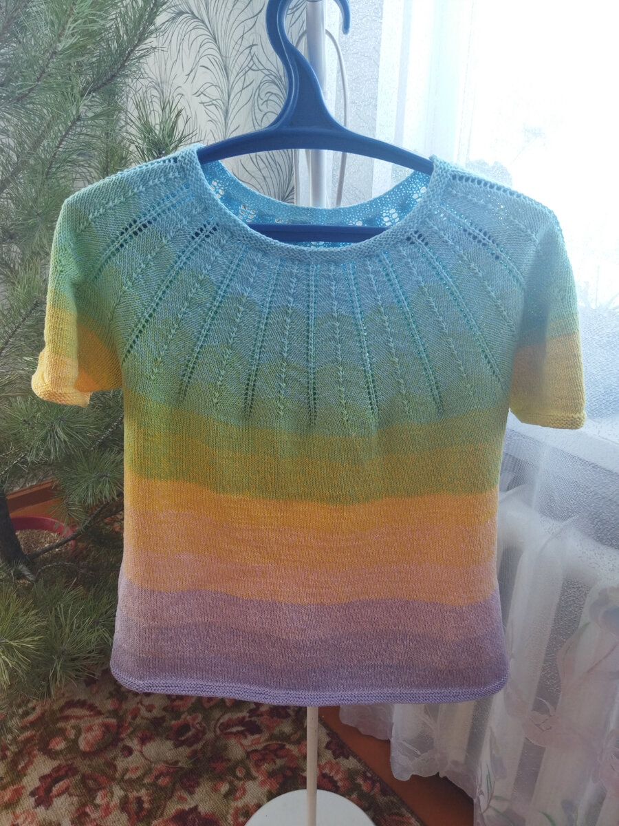 Летняя футболка связана из пряжи ЯрнАрт Фловерс Монлайт спицами 2.5..