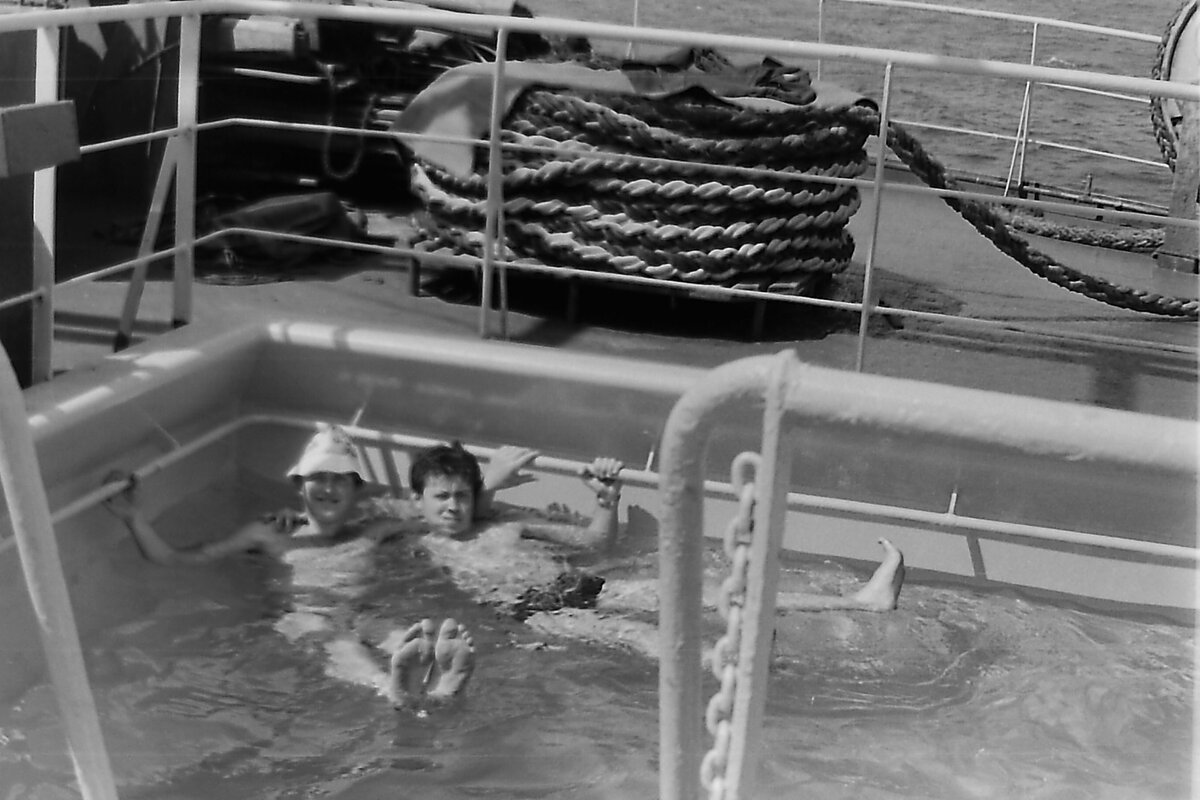 Вода в судовом бассейне была забортная, офигенски солёная и нам после бассейна приходилось в ду́ше ополаскиваться пресной водой иначе соль при ходьбе начинала поскрипывать.