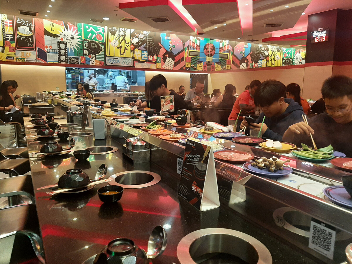 В городе Паттайя (Таиланд) есть очень замечательный ресторан с японской кухней. Замечателен и примечателен он тем, что в нем, вы можете есть суши сколько хотите. столько сколько в вас влезет. Этот ресторан безлимитный и ограничивает вас только по времени прибывания. Нужно уложится поесть не более чем за 1,5 часов. И в этом кафе еще очень оригинальная подача блюд. Конвейер из тарелок на которых лежат разные продукты (креветки. мясо, рыба, грибы. салаты и т.д.) Суши постоянно меняются и подкладываются поварами этого ресторана. Выбор такой большой, что если всего попробовать по чуть чуть, то вы будите уже сытым человеком. Впечатляет еще то что стоимость посещения этого безлимитного японского ресторана составляет всего 419 бат и ориентировочно 850 рублей (а сколько стоит одна порция суши у нас в России?) Очень удобно приходить сюда семьей с детьми. Дети ростом до 110 см. проходят бесплатно. По мимо суши вам ставят на выбор наваристый бульон (том ям, куриный или овощной) в котором вы может