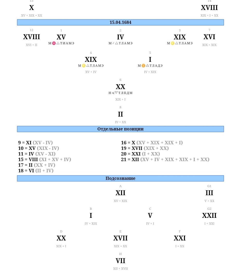 Екатерина I родилась 15.04.1684 г. Её подсчет похож на дату Аллы Пугачевой (15.04.1949). Тот же своенравный, яркий и темпераментный "Дьявол" до 20 лет, который умеет постоять и заявить о себе. Что такое нумерологический портрет читаем здесь. История её судьбы и любви здесь. Давайте разберем основные моменты портрета Екатерины I и посмотрим, что помогло ей из Золушки превратиться в Императрицу. ✔️ У Екатерины I в дате рождения присутствует несколько таких "буйных и темпераментных" арканов. В первой части жизни, особенно в возрасте до 20 лет стоит аркан "Дьявол". Аркан -искуситель, это сильнейшая природная энергия, страсть. Аркан олицетворяет земные радости, удовольствия, азарт к жизни, секс. Это любвеобильные и харизматичные личности. Оно и понятно, не зря её передавали из рук в руки. Кухарка кухаркой ,а сколько мужчин было от неё в восторге. Шереметьев, Меньшиков и сам Петр I. ✔️ Возраст после 20 лет, когда уже надо прорабатывать задачи и проходить уроки. И здесь кажется, Екат