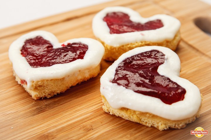 Из готового бисквита по трафарету или с помощью резака вырежьте сердечки, смажьте их вареньем, а по краю взбитыми сливками.