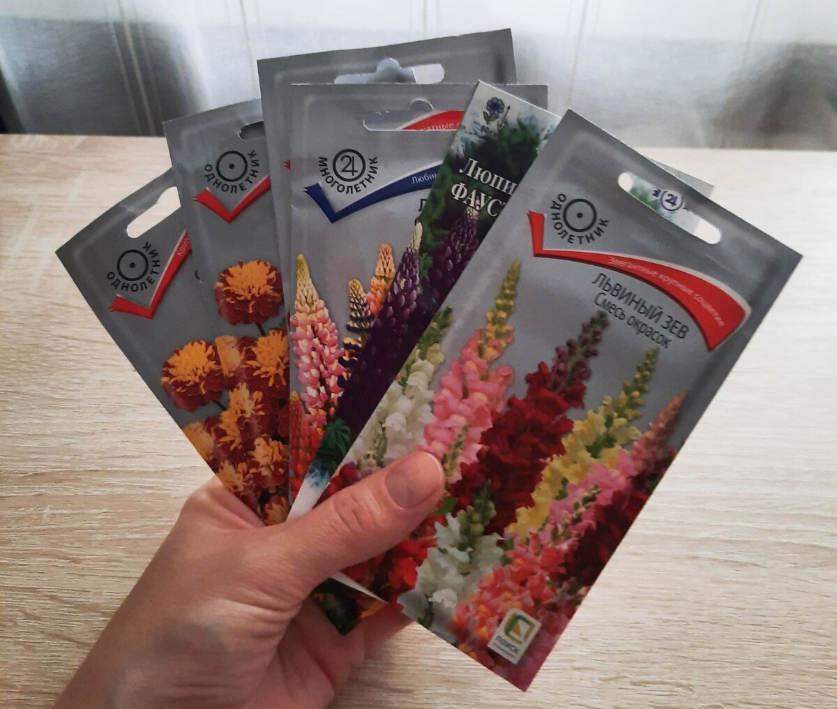 На работе завал, времени почти ни на что не хватает. Но в выходные успела немного закупиться семенами. Среди прочего, конечно же, - цветы. Взяла что попроще, чтобы не возиться с рассадой. Но не исключаю, что в ближайшее время все же приобрету цветы и на рассаду. Семена со своих дачных цветов не собрала в прошлом году, так получилось. Итак, первое приобретение - наверное, самые популярные у всех бархатцы. Классика всех садоводов-огородников. Я их обожаю. Взяла отклоненные, растут кустиками. Оба сорта невысокие, потому что сажаю их вдоль грядок. Цветут все лето и даже дольше) Так же сразу в грунт сажаю львиный зев. Рос у меня в позапрошлом году и чуть-чуть пророс в прошлом от упавших в землю семян. Вообще неприхотливый, ничего не делала после посадки, только любовалась. Еще взяла люпин. Так как высокий, хочу расположить у забора. Сажать на рассаду его не буду. Посмотрим, что получится. Вообще, конечно, в магазине глаза разбегаются. Хочется взять почти все. Но тут ведь еще важно плани