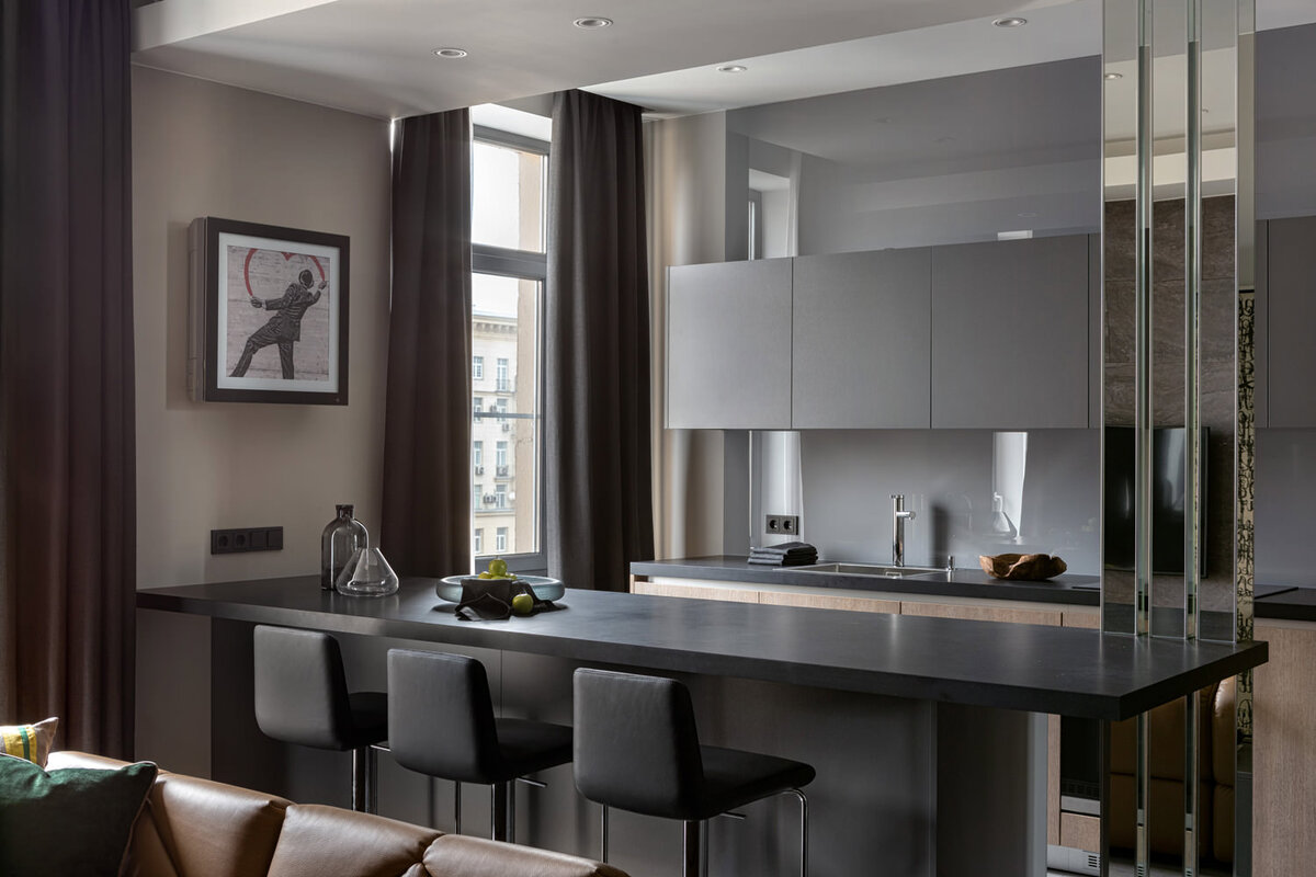 Линейный кухонный гарнитур соседствует с барной стойкой, над которой пришлось особенно долго поработать. Сперва пришлось спрятать газовую трубу, а для этого соорудить зеркальную колонну (некоторые коммуникации в доме проходят очень странно). Саму зону барной стойки выделили с помощью понижения уровня потолка. Это позволило разместить дополнительное светодиодное (и не только) освещение над ней, чтобы можно тут было не только пить, но и работать, а также визуально зонировать пространство.