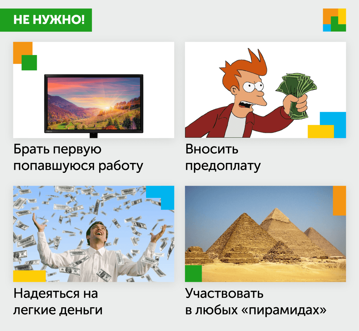 В-третьих, повод насторожиться, если вас просят внести предоплату под каким-то предлогом. Ни при каких условиях этого делать не нужно. Так же, как и участвовать в финансовых пирамидах – любых! Схема заработка в них строится так, что доход получают «верхи», остальные рано или поздно теряют деньги.