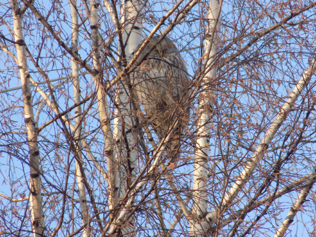 В последнее время я увлекаюсь бердвотчингом, т.е. наблюдением за птицами. И моей мечтой было увидеть сову! Но сова мне никак не попадалась. Из-за снежной зимы в Сибири в этом году совы часто появляются в городах, т.к. ловить мышек тяжело в лесу, а многие мои знакомые из других городов уже сфотографировали по 1-2 виду сов. Вчера, послушав очередные обсуждения знакомых натуралистов о том, как они фотографируют сов, я написала подруге: нам тоже нужна сова! Мы с ней часто вместе ездим в лес наблюдать за птицами... Но я не думала, что моя удача так близко! Буквально через 2 часа после сказанного, я вышла в магазин и, возвращаясь, заметила на дереве возле дома странный комочек снега. Фотоаппарат, конечно, всегда с собой. На всякий случай приблизила зумом, чтобы рассмотреть что это... Ну, мало ли. И, о чудо, это оказалась сова! А если точнее, то длинно длиннохвостая или уральская неясыть. На латыни: Strix uralensis. Это одна из самый крупных неясытей. Конечно же, я сразу собралась ее рисоват