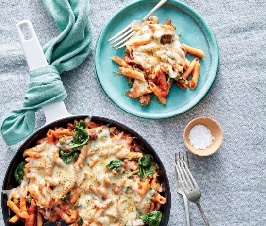 Эта легкая запеканка из макарон на сковороде — верный семейный хит. Паста и мясной соус с сыром моцарелла порадуют всех за столом, а техника «все в одной сковороде» заставит повара улыбаться. Приготовление макарон в мясном соусе не только уменьшает количество блюд, которые вам нужно приготовить, и время, необходимое для приготовления ужина, но и крахмалы в макаронах загущают соус — и вам не нужно делать ни одной дополнительной операции. Ингредиенты: Приготовление: Приятного аппетита!