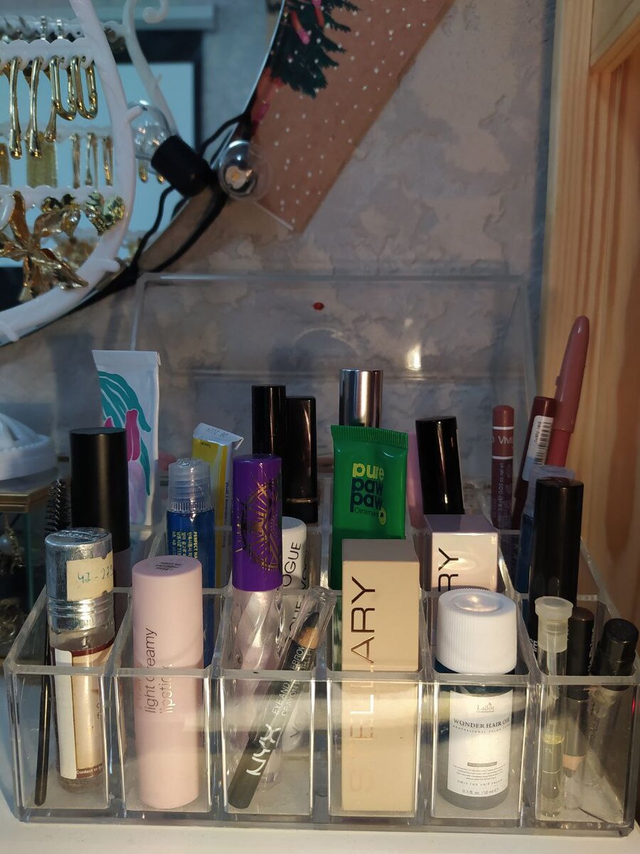 На то, чтобы всё достать, протереть и сфотографировать ушло от силы 40 минут, кстати. Избавилась от трёх вещей: белящего геля для бровей, высохших жидких теней и коричневой помадки для бровей, не подходящей мне по цвету.