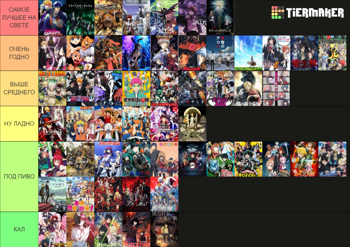 Решил навалять рейтинг аниме на tiermaker.com, некоторых произведений там не было. Если вам интересно моё мнение на конкретный тайтл, то напишите комментарий и я отвечу. Ну и разумеется, алкоголь я осуждаю. САМЫЕ ЛУЧШИЕ НА СВЕТЕ 1) Невероятные приключения ДжоДжо (Джозеф лучший) 2) Психопаспорт 3) Атака титанов 4) Врата Штейна 5) Код Гиас (2 основных сезона) 6) Эксперименты Лэйн 7) Тетрадь смерти Это список произведений, которые очень сильно повлияли на мою жизнь, и я благодарен за то, что они есть. На счёт "Берсерка": много идей для размышления, но пока его дописывают, не могу поставить в "САМОЕ ЛУЧШЕЕ НА СВЕТЕ". Может быть на каждое из этого списка напишу разбор и мнение. Только не расстраивайтесь, если увидели любимое произведение не на желаемом месте, а лучше спросите, почему я так думаю.