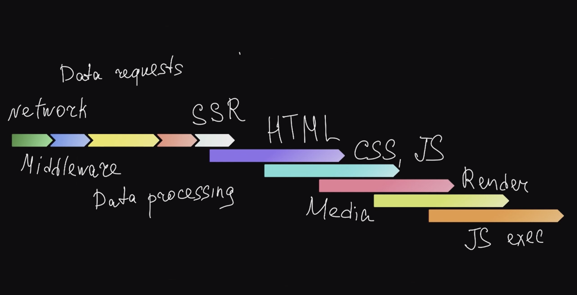 Серверная часть — это сеть, middleware, запрос данных, обработка данных и SSR. А на клиентской части скачиваются HTML, CSS, JS, рендерятся картинки, выполняется JS. Это относительная схема — в клиентской части всё не именно так накладывается друг на друга. Ну и у каждого проекта схема будет своя.