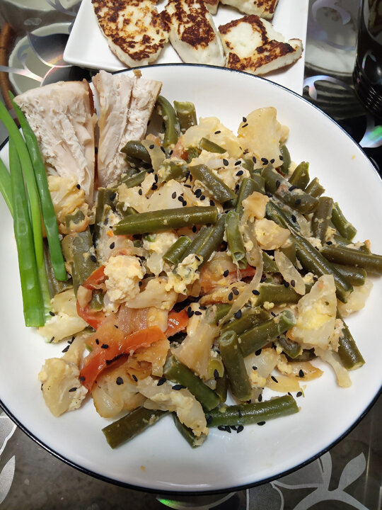 Приготовила «наше», диабетическое, блюдо из стручковой фасоли и цветной капусты. Так понравилось, что не могла наесться – нежное, сочное, вкусное! Отвариваем слегка 400 г замороженных стручковой фасоли и цветной капусты. В сотейнике тушим нарезанную полукольцами среднюю луковицу до прозрачности, затем добавляем нарезанный дольками свежий помидор. Добавляем отваренные фасоль и цветную капусту, тушим 5 минут на слабом огне, добавив ложку водички, в которой варилась фасоль, или соевого соуса без сахара. Добавляем соль, душистый перчик, душистые приправы и два сырых взбитых яйца. Перемешиваем, через 3 минутки выключаем огонь, и подаем, посыпав семенами чиа и измельчёнными грецкими орешками. Плюс несколько кусочков обжаренного на антипригарной сковороде адыгейского сыра, и чашечка заваренного измельчённого шиповника. Надеюсь, что и Вам понравится! Больше общения и рецептов - в группе "Рецепты для диабетиков" в ВКонтакте! Рецепт на странице Автор рецепта - Марина Лобастова
