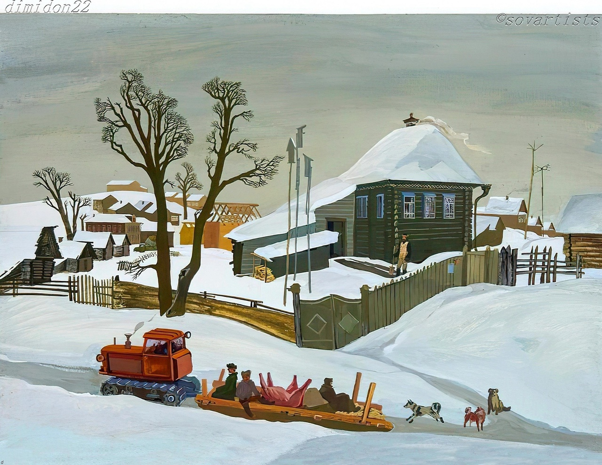 Сенников Дмитрий Николаевич (24.06.1947, п. Кировский Приморского края - 27.12.2020, Киров). «Зима в Поломе». 1982 год. Бумага, темпера; 470 х 670 мм.; (Государственный музейно-выставочный центр «РОСИЗО»). Источник: Художники СССР 1950-1990 | ВКо Чем не сказка на картине художника? Деревенька. Вместо русской печи, на которой герой сказки «По щучьему велению» ездил Емеля, гусеничный трактор, на котором едут колхозники, герои советских сказок. За ними несутся собачки. Сказочная колхозная идиллия. И вы не поверите, но так было на самом деле, а не только на картинах советских художников.