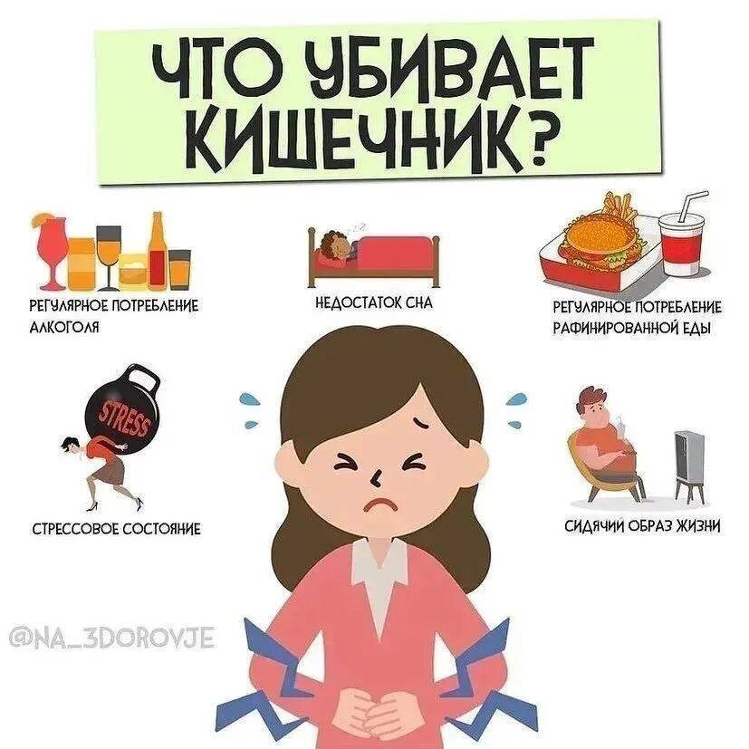 ПОЛЕЗНО ЗНАТЬ 🧐 Что разобщает наш кишечник? 1️⃣ РЕГУЛЯРНОЕ ПОТРЕБЛЕНИЕ АЛКОГОЛЯ Если о пользе вина до сих пор ведутся споры о том, что бокал никак не повляет на состояние нашего здоровья, то с крепкими напитками дела обстоят куда более понятно Напитки с высоким содержанием спирта приводят к тому, что кишечник прекращает всасывание белка, витаминов и других полезных элементов Поэтому системное потребление алкоголя может привести к необратимым последствиям 2️⃣ СИДЯЧИЙ ОБРАЗ ЖИЗНИ Гиподинамия влечет за собой ряд заболеваний, куда также входит и нарушения пищеварения (нарушение функций кишечника) 3️⃣ РЕГУЛЯРНЫЕ СТРЕССЫ Переживания в значительной степени влияют на состояние нашего ЖКТ Язвенные болезни желудка и двенадцатиперстной кишки, также известен синдром раздраженного кишечника – СРК, который может развиться все из-за тех же переживаний 4️⃣ НЕДОСТАТОК СНА Недосыпы приводят к нарушению кишечного барьера и повышенному накоплению жиров
