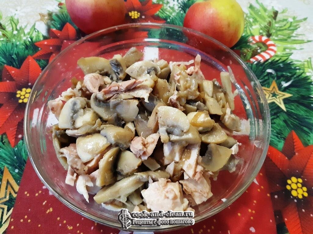 Сегодня приготовим самый простой, но от этого не менее вкусный салат с отварной курицей и грибами. Для такого простого салата понадобится всего три ингредиента: лук, шампиньоны и курица. Для вкуса можно добавить и соленых огурчиков. Заправлять салат будем соевым соусом. Но на ваш вкус можно взять и любую другую заправку. Лук репчатый нарезаем четверть кольцами. И слегка обжариваем на сковороде. Чистим и нарезаем шампиньоны. Отправляем обжариваться к луку. Можно взять и консервированные шампиньоны. Из курицы можно взять и грудку и любую другую часть. Я предпочитаю брать куриные бедра или окорочка, так мясо получается нежнее. Отвариваем предварительно курочку, а затем мелко нарезаем. В салатник выкладываем обжаренные грибы и лук, добавляем курицу. Добавляем черный молотый перец и соевый соус. Все перемешиваем. Салат не советую солить, в соевом соусе и так достаточно соли.