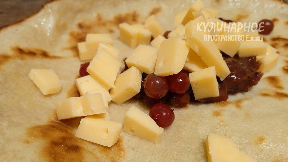 4. Сыр. Просто добавить в блины сыр это вкусно, особенно если подогреть на сковороде или в микроволновке. Не банальной добавкой к сыру будут ягоды брусники моченой и соус из крыжовника. В результате получилось достаточно приятное тягучее ощущение теплого расплавленного сыра и взрывной вкус брусничных ягод, со слегка заметными нотками крыжовника! Блины квашено брусничные Радости вкуса: Квашено капустный,