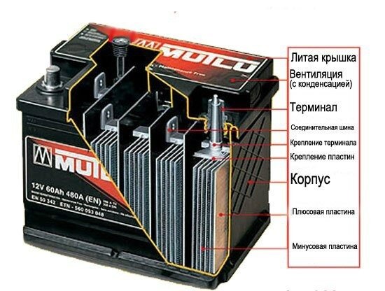 Аккумулятор – это контейнер который состоит из шести отдельных секций. Каждая отдельная секция представляет собой отдельный источник питания (вырабатывает каждая секция около 2,1В), внутри секции находятся две пластины (сделаны из свинца), положительная и отрицательная, отделенные друг от друга. Масса аккумулятора состоит из: веса электролита, свинцовых пластин и соединений, и составляет примерно 16-17 кг.