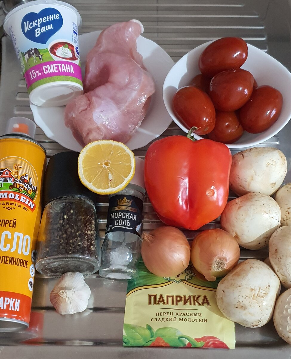 Простое и вкусное блюдо, которое можно приготовить в будний день, а можно и на праздничный стол. Если добавить побольше овощей может стать самостоятельным блюдом не требующим гарнира. Ингредиенты: - филе индейки 400 грамм - шампиньоны 200 грамм - помидоры консервированные в собственном соку 300 грамм - перец болгарский 1 штука - лук репчатый 1-2 луковицы - сметана жирностью 15 % 150 грамм - сок лимона 1 столовая ложка - чеснок 1 зубчик - паприка сладкая молотая 1 чайная ложка - соль и чёрный молотый перец по вкусу - масло подсолнечное 3 столовые ложки Мясо индейки нарезать достаточно крупными кусочками. Лук очистить и нарезать мелким кубиком. Чеснок очистить и пропустить через пресс или натереть на мелкой терке. Перец помыть, удалить семена и плодоножку и нарезать тонкими брусочками. Грибы помыть на нарезать на четвертинки. С томатов удаляем кожуру и превращаем в кашицу с помощью ножа. В хорошо разогретом масле на высокой температуре обжарить индейку до золотистой корочки,