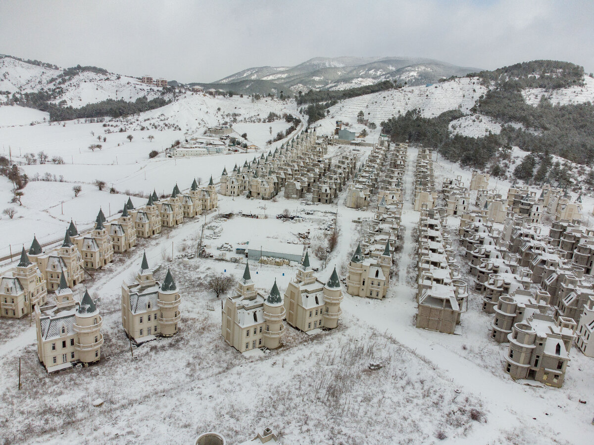Неподалёку от турецкого городка Мудурну есть очень необычная и неоднозначная достопримечательность. 732 абсолютно одинаковых коттеджа в стиле диснеевских замков! Когда смотришь на это, то невозможно избавиться от ощущения, что находишься в какой-то компьютерной игре, в режиме редактора карт. Выбрал понравившееся строение и замостил ими всё до горизонта! С одной лишь разницей – баловство школьника-игромана каким-то образом просочилось в реальный мир! Не хватает только сказочной принцессы, машущей платочком с балкона и дракона, прикованного к замку цепью и охраняющему принцессу. Разумеется, всё это должно быть пиксельным, в формате 640х480. И в количестве 732 шт! Да, и звучит, и выглядит всё это максимально безумно и крипово, но тем не менее имеет место быть!