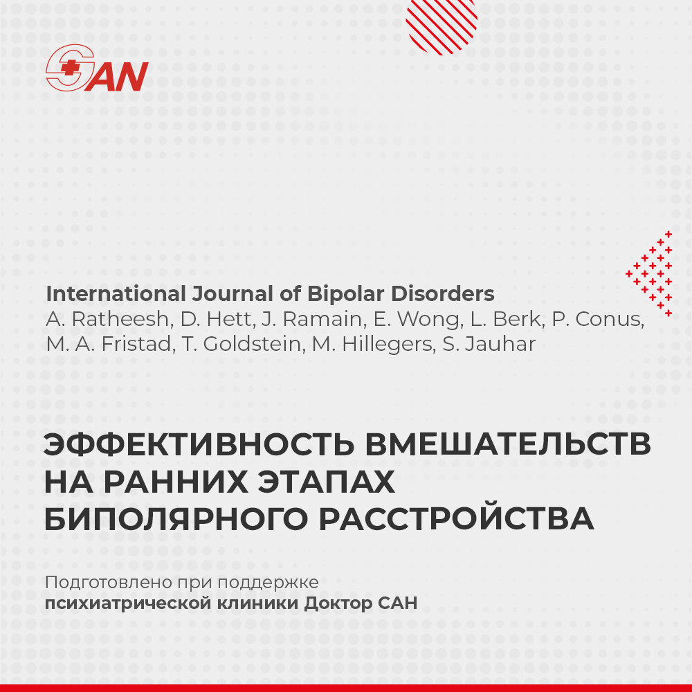 В систематическом обзоре оценивалась эффективность различных вмешательств на ранних этапах биполярного аффективного расстройства (БАР) I или II типа. Имеющиеся данные свидетельствуют о том, что применение лития на ранних стадиях заболевания было связано с более низким риском рецидива по сравнению с применением других стабилизаторов настроения. Использование стабилизаторов настроения было связано с лучшим общим функционированием по сравнению с использованием нейролептиков в среднесрочной перспективе. В то время как итоговые данные о психотерапии были ограничены гетерогенностью, семейные и когнитивно-поведенческие вмешательства были связаны со снижением риска рецидива или улучшением симптоматических исходов. Были некоторые доказательства того, что одни и те же фармакологические вмешательства предотвращали рецидивы эффективнее, когда осуществлялись на более ранней, а не на более поздней стадии заболевания. Подробнее о лечении БАР: https://doctorsan.ru/lechenie-bipolyarnogo-rasstroystva