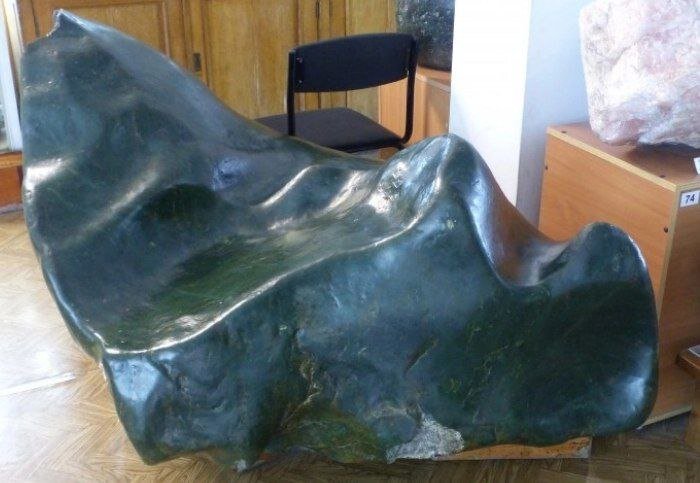 #геология #минералогия #старательство #rocks #minerals #crystals #stones #Mining #TheLastSiberianArgonafta «Седло Чингисхана» - нефрит из Иркутска В Иркутске, в Минералогическом музее им. А.В.Сидорова (Иркутского государственного технического университета) находится интересный экспонат – нефритовый валун весом более 1,5 тонн необычной формы. Окатанный валун прекрасного зелёного цвета нашли в 1974 году в верховье реки Хохюрты (Хамар-Дабан). За свою необычную природную форму валун получил название «Седло Чингисхана». В 1983 году камень передали на хранение в минералогический музей. «Его привезли на КамАЗе, выгрузили на площадку перед музеем, сломали несколько плиток. 15 студентов, обвязав камень веревками и подставив под него круглые фрагменты бревен, закатили валун в экспозиционный зал» — рассказывает специалист экспозиционно-выставочного отдела Любовь Лузгина. С тех пор нефритовая глыба лежит в зале Среди студентов существует примета, что если перед экзаменом сесть на валун, то