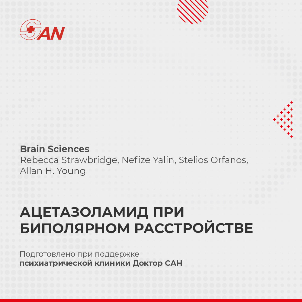 Ацетазоламид («Диакарб») – ингибитор карбоангидразы, улучшающий ГАМКергическую передачу, одобрен для лечения глаукомы, эпилепсии и в качестве слабого диуретика. Было подчеркнуто, что он может быть полезен пациентам с биполярным расстройством, для которых стандартные методы оказались недостаточно эффективны. По оценкам предварительного обзора существующих статей, у 44% пациентов был достигнут ответ (по-видимому, не зависевший от исходного типа эпизода, дозы ацетазоламида или продолжительности), в то время как у 22% отмечался лишь минимальный эффект. В целом сообщалось, что ацетазоламид хорошо переносится и приемлем на срок до 2 лет. Рассмотренные доказательства чрезвычайно ограничены по размеру и методологии и носят лишь предварительный характер. Подробнее о лечении БАР: https://doctorsan.ru/lechenie-bipolyarnogo-rasstroystva