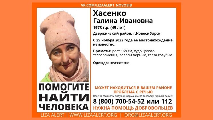 В Дзержинском районе Новосибирска без вести пропала 49-летняя Галина Хасенко, местонахождение которой неизвестно с 25 ноября 2022 года. Об этом 8 февраля 2023 года рассказали волонтеры поисково-спасательного отряда (ПСО) «Лиза Алерт» в социальной сети «ВКонтакте». Приметы пропавшей: рост 168 сантиметров, худощавое телосложение, волосы черные, глаза голубые. У женщины есть некоторые проблемы с речью. Во что была одета сибирячка в день исчезновения – неизвестно. Если у вас есть информация о местонахождении Галины Хасенко, сообщите об этом по телефону ПСО 8-800-700-54-52 иди наберите 112. Ранее «Вести Новосибирск» рассказывали, что семья, полиция и волонтеры поискового отряда «Лиза Алерт» ищут 17-летнего подростка из Октябрьского района областного центра.