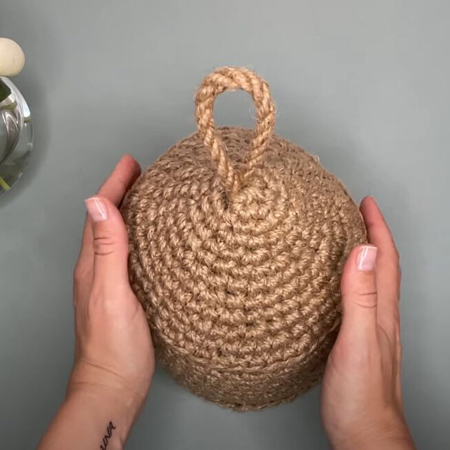 Для своей грелки крючком мастерица выбрала вовсе не пряжу жизнерадостного цвета, а джутовую веревку. Получилось лаконично и симпатично. Нравится идея?