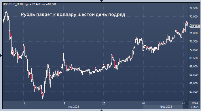Рубль готов к самому низкому закрытию за месяц по отношению к доллару Курс доллар/рубля на Мосбирже интервалами в 1 минуту Курс доллар/рубля на Forex интервалами в 4 часа Рубль слабеет по отношению к доллару уже шестую сессию и движется к самой длинной серии потерь с декабря. Российская валюта может упасть по отношению к евро впервые за четыре дня. Рубль снизился на 0,6% на торгах в Москве до 71,5875/$. Пара USDRUB, скорее всего, протестирует 72-73 в краткосрочной перспективе, поскольку траектория курса рубля продолжает определяться торговым балансом даже с учетом продаж юаней по бюджетному правилу, считает аналитик ИК «Открытие Инвестиции» Александр Шураков. «Снижение предложения иностранной валюты со стороны экспортеров и увеличение спроса на иностранную валюту на фоне значительного увеличения рублевой ликвидности со стороны государства формирует условия для ослабления рубля», — отметил он в записке. Продажи юаня лишь сглаживают слабость российской валюты, не предотвращая ее падения.