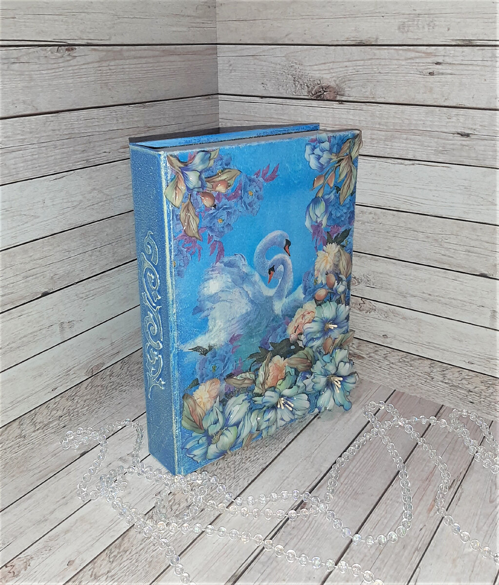О лебединой верности и любви слагают песни и легенды, эта птица — воплощение грации, красоты и величия. На Лебедином озере в г. Астрахань я наблюдала воочию, насколько это изящные и утонченные создания (несмотря на довольно внушительные размеры и устрашающий клюв, кстати))). Лебединому мотиву посвящаю свою новую переделку. Насколько это удалось, посмотрим вместе))). Понадобилось: заготовка шкатулки-книги из фанеры и картона, декупажная салфетка, акриловые краски (белая, синяя, желтая), шпатлевка, акриловый лак, клей ПВА, горячий клей и клеевой пистолет, трафареты, наждачная бумага, кисти, декоративные элементы из термопластика. Переделывать будем шкатулку, которая в общем-то и так замечательная, крепкая, с красивым мотивом, но погрызенная горячо любимым котенькой. Дорогой Филя позаботился, чтобы хозяйке не пришлось скучать и было, чем заняться, пока еще в пути заказанные заготовки для декупажа))). Внутреннюю часть решила не трогать, остается такой, как есть: Первым делом затираем шпатл