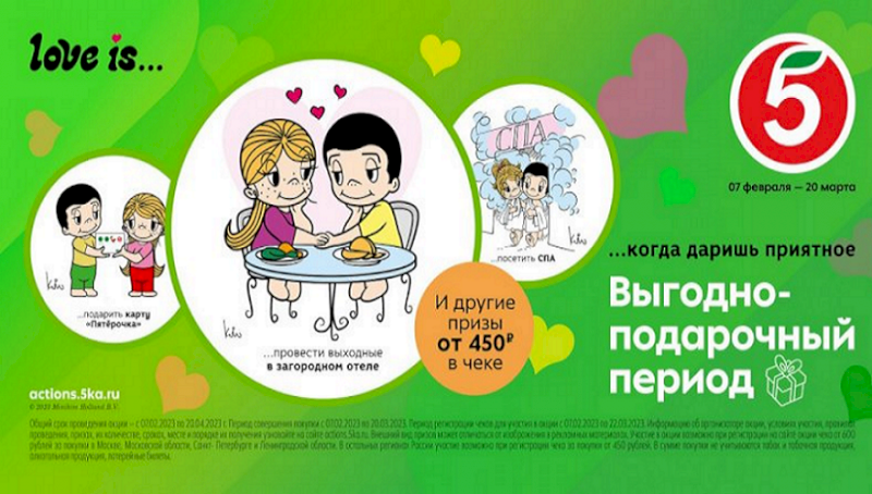 «Пятёрочка» в преддверии Дня всех влюблённых, 23 февраля и 8 Марта запустила акцию «Выгодно-подарочный период». Торговая сеть разыграет среди покупателей более 3 тыс. призов, среди которых подарочные карты, сертификаты в спа, цифровая техника и многое другое. Поучаствовать в розыгрыше смогут и жители Свердловской области. Акция продлится до 20 марта. Чтобы стать ее участником, достаточно совершить покупку в любом магазине «Пятёрочка» на сумму от 450 рублей. После этого покупатели получат гарантированный романтический приз - электронную открытку в стиле популярной серии Love is, отрисованную эксклюзивно для торговой сети. Открытками, символизирующими настоящие и светлые чувства, можно будет делиться с друзьями через мессенджеры. За время акции гости магазинов могут собрать всю коллекцию из 10 открыток и одновременно принять участие в розыгрыше Smart-телевизора. Также каждый участник акции получит шанс выиграть романтические подарки, такие как сертификаты в спа, салоны красоты или на отд
