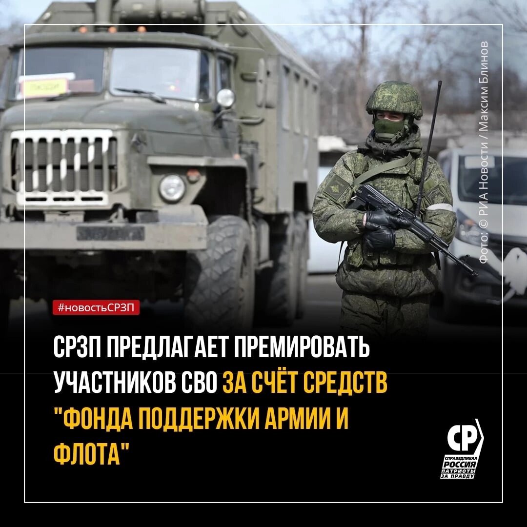 В последние дни появилось много высказываний от представителей региональной власти, депутатов и бизнеса о готовности выделять средства на премирование участников СВО за уничтожение натовской техники на Украине. Это единение свидетельствует о готовности российского общества сплотиться перед серьёзными угрозами, нависшими над нашей страной. Премировать участников СВО просто необходимо, но делать это надо централизованно. Суммы должны быть одинаковыми и выплачиваться из единого источника. 🪖 Партия СПРАВЕДЛИВАЯ РОССИЯ – ЗА ПРАВДУ уже выступала с инициативой создания "Фонда поддержки армии и флота". Необходимо вернуться к рассмотрению этого вопроса. Мы предлагаем пополнять фонд: ✅ За счет повышения НДФЛ для граждан с годовым доходом более 50 млн рублей в год. Сейчас граждане с годовым доходом более 5 млн рублей в год платят НДФЛ не 13%, а 15%. Мы же предлагаем для граждан с годовым доходом более 50 млн рублей в год увеличить НДФЛ до 18%, и эти дополнительные 3% направлять на нужды фонда.
