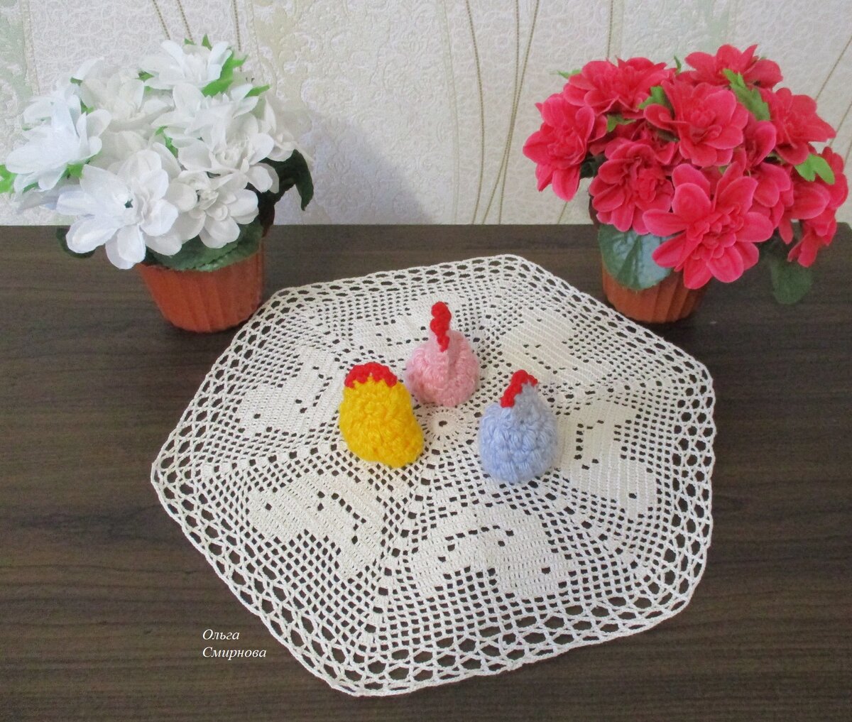 Родилась вот такая салфетка с курочками шестиугольной формы опять таки в филейной технике, но вязанием по кругу.