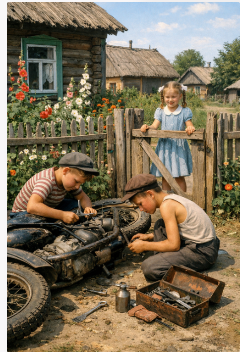 Марина вышла из дома...Нет, не так, возиться Макс с мотоциклом, Мишка и Колька с Петькой ему помогают, скрипнула дверь, Макс голову повернул, а там...из их дома девчонка вышла...Пацаны аж рты раскрыли.