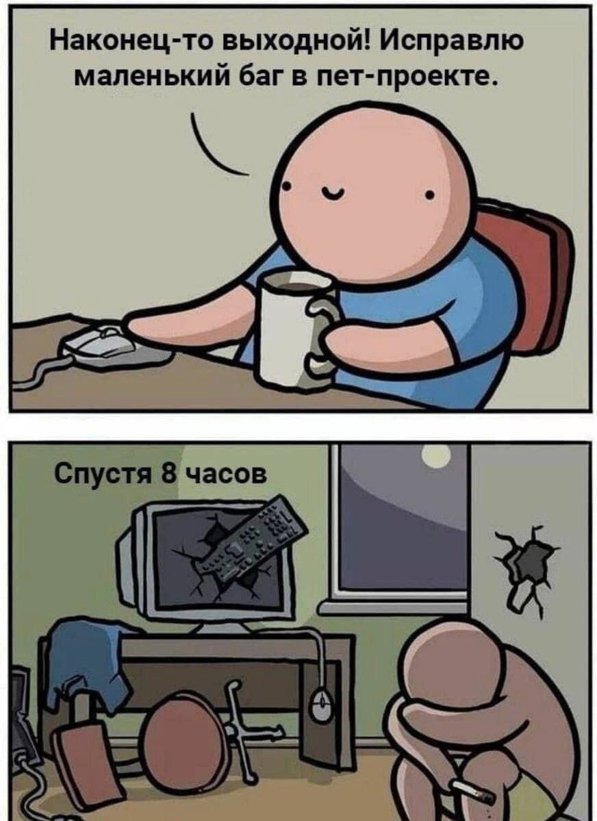 И так бывает всегда! Садишься работать с утра, думаешь, хммм, сейчас ка я исправлю вон тот баг и еще вон те десять... Уже вечер, а первый баг еще не исправлен, от куда ноги растут неизвестно. VK || Discord || Steam