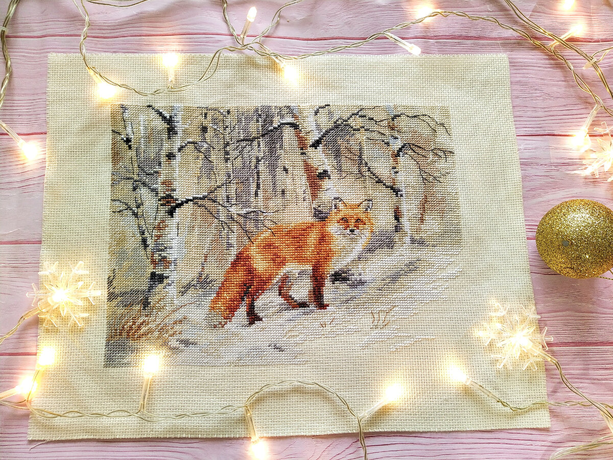 Привлекли меня сразу в этом сюжете скромные цвета зимнего леса и ярко-рыжие - лисицы. Такой контраст не может не броситься в глаза, не может не полюбиться. Очень много полукреста в сюжете в несколько сложений было легко вышивать, жемчужно-сизые оттенки добавляли удовольствия.