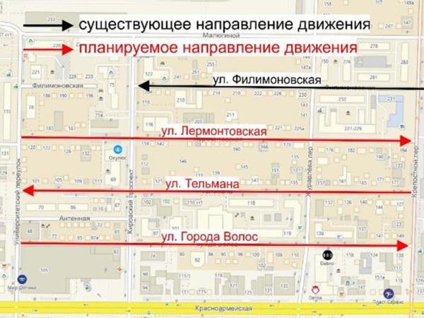 Нововведение коснется улиц Лермонтовской, Города Волос и Тельмана. По первым двум водителям разрешат ездить в восточном направлении (от Университетского переулка до Крепостного). По Тельмана — в обратную сторону (от Крепостного переулка до Университетского).