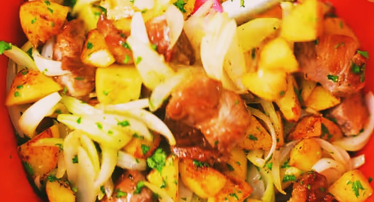 Привет, мои дорогие друзья! Сегодня мы приготовим очень вкусное блюдо из мяса и картошки. Поверьте, приготовив его раз, вы влюбитесь навсегда. Свиная шея 700 г. Можно приготовить из другого мяса. Нарезать мясо на порционные кусочки. Лучше достать мясо из холодильника заранее, чтобы оно прогрелось до комнатной температуры. Хорошо разогреть сковороду. Обжарить мясо на сильном огне до готовности. Переложить готовое мясо в миску. Жир остается в сковороде. Мы будем обжаривать другие ингредиенты наНарезать 4 средние луковицы около 400 г. Обжарить лук 1-2 минуты. Не нужно его жарить до румяности.Обжарить лук 1-2 минуты. Не нужно его жарить до румяности. Лук стал прозрачным. Переложить лук в миску с мясом. 1 кг картофеля нарезать небольшими ломтиками. Растопить небольшой кусочек сливочного масла на сковороде. Обжарить картофель на среднем огне до готовности. Накрыть крышкой, не перемешивать 5 минут, чтобы картофель подрумянился. Мелко нарубить 1-2 зубчика чеснока. Мелко нарубить небольшой п