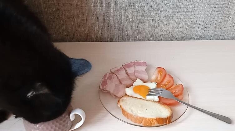 Привет всем кошачьим! Как вы помните, ради вас я собирался пойти на преступление - стащить со стола хозяйский завтрак. Но остальные жители этого дома тоже захотели поучаствовать в авантюре. Нечасто доводится так повеселиться, да еще и вкусно покушать. Пока один исследовал стол, остальные стояли на карауле. Первым отправили меня. Мол, ты все придумал, вот и иди. Я тихонько запрыгнул на стол и осмотрелся. Завтрак меня разочаровал - колбасные изделия, пусть это даже грудинка домашнего приготовления, я не люблю. Яйца терпеть не могу, а помидоры уж и подавно. Порадовало только свежее молочко в чашке. Его нам не дают, чтобы не было расстройства пищеварения. Вот его я попил с удовольствием. А уборка лотка - это хозяйская обязанность. Следующей я отправил Несси, думал она посмелее. Но она тоже ограничилась только молоком. Не стала есть ни ветчину, ни яичницу. Она все обнюхала, запах показался не очень аппетитным. Но вернулась довольная, вдоволь напившись молока. Последней пошла Дуся. Сначал