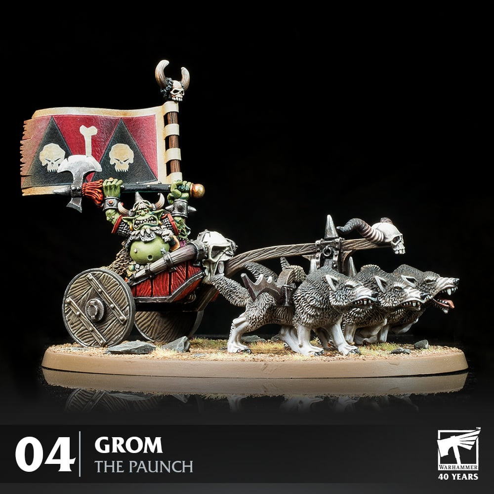 В этой статье поговорим про одного из первых особых персонажей, украсивших столы и полки фанатов. Конечно, же — это Гром Пузатый! Некоторые считают этого тучного военачальника первым настоящим особенным персонажем в Warhammer. Он повел множество орд однообразных гоблинов-копейщиков, с чрезвычайно острыми копьями, о которые реально можно было пораниться, в двух измерениях против надменных высших эльфов Ултуана. Как и подобало его положению, Гром ехал в битву на колеснице, запряженной тремя волками, в сопровождении своего знаменосца Ниблета — имя, которое сохранилось до наших дней в названии определенного цвета краски от Citadel. По крайней мере, еще один знаменитый зеленокожий с прочным развевающимся знаменем. Колесницы и по сей день остаются опорой многих армий Эпохи Зигмара. Гроты дружили с волками на протяжении всей истории Warhammer, и Наездники Кривоклыков возродили это древнее партнерство во Владениях Смертных. В настоящее время во многих сеттингах Warhammer гораздо больше специал