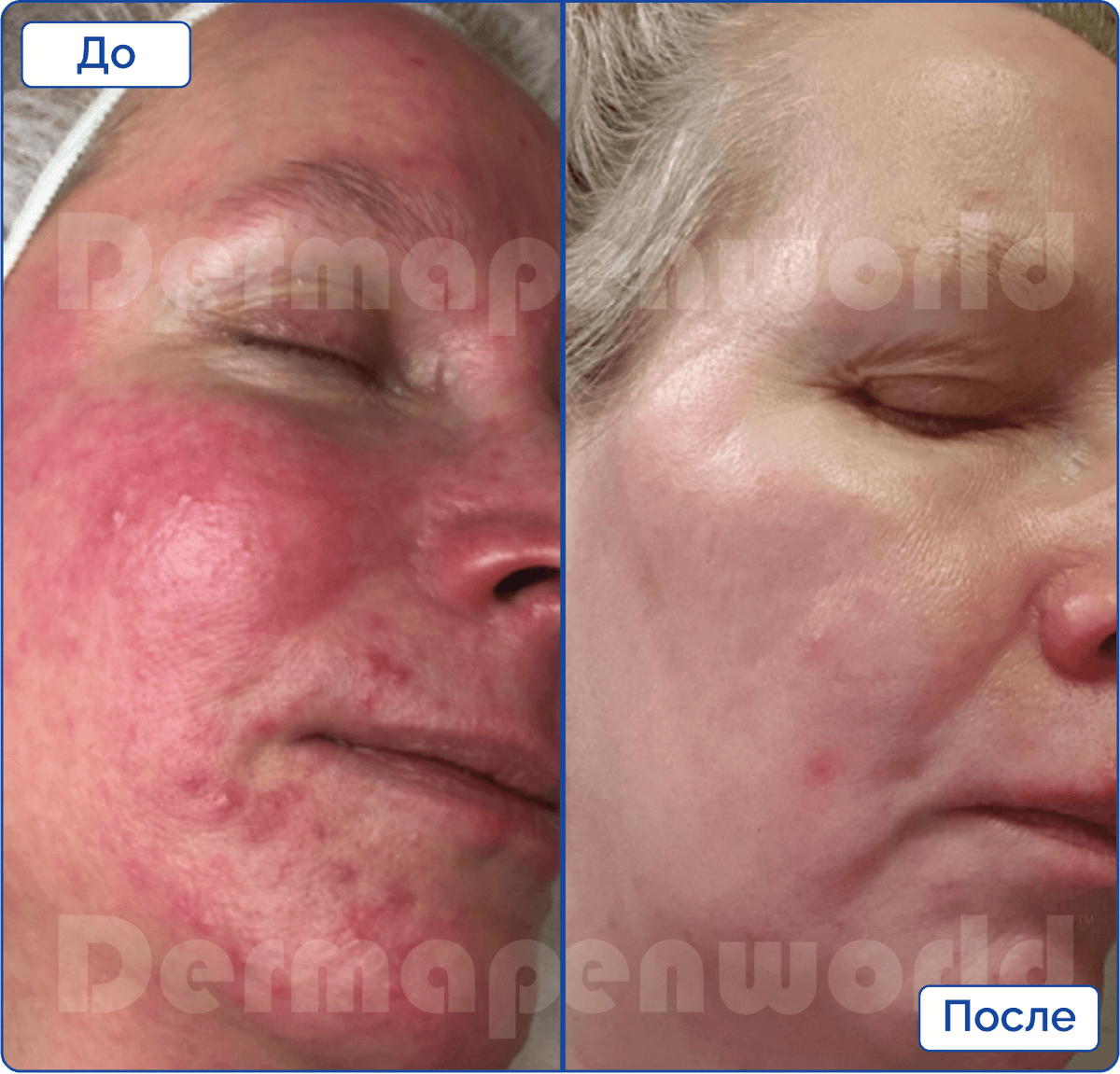 Розацеа в переводе с латыни – «сделанное из роз», упоминание о котором появилось в эпоху Возрождения, а для пациентов – сущее страдание, весьма далекое от высокого литературного стиля. Хроническое, рецидивирующее заболевание, преимущественно охватывающее женское население от 40 лет, а мужчины, хоть и страдают реже, но протекает оно гораздо серьезнее. Розацеа поражает преимущественно кожу лица, хотя может развиваться и на других частях тела. Ключевым моментом считается повреждение капиллярной сети кожи, ее стойкое расширение, и как следствие, поражение кожи, с формированием папул, пустул, трансдермальная потеря влаги, нарушение барьерной функции кожи. Существуют ряд теорий и мнений о механизме развития заболевания, которые сводятся к мысли, что эту непростую патологию нужно лечить междисциплинарно. Для улучшения состояния кожи, нормализации капиллярного русла, снятия воспаления, успешно применяется технология микроиньекционной терапии Dermapen 4. Dermapen 4, создавая мощный поток микрои