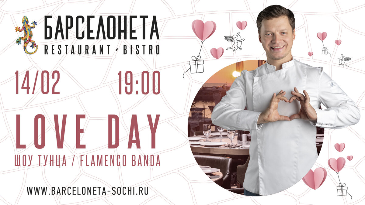 В ресторане Barceloneta (Несебрская ул, 6) предлагают отмечать уже с утра. Гостям на завтрак подадут игристое, а в течение всего дня будут радовать сладким комплиментом — десертом ПавLOVE (суфле с клубничным джемом в форме сердца). В вечерней программе, которая начнется в 19:00, выступление группы «Фламенко банда» и танцевальное шоу в испанском стиле. Кульминация праздника наступит в 19:30 когда шеф-повар Алексей Павлов разделывает большого 35-килограммового тунца со Шри-Ланки. Из гигансткой рыбы приготовят 4 блюда: севиче, сашими и тартар с гуакамоле (все по 1290 руб.) и стейки (1990 руб.). Гостей ресторана «Морской» (Войкова ул, 1) ждет иммерсивный спектакль от Нового Театра Сочи. Шеф-повар же предложит меню из афродизиаков: устрицы в цитрусовом соусе понзу, филе лосося с имбирем и перцем чили, равиоли с морепродуктами, жареные морские гребешки с вяленой олениной и жареный ананас с кардамоном. С 19:00 всех будут встречать приветственным бокалом игристого. Стоимость билета - 6500 рубл