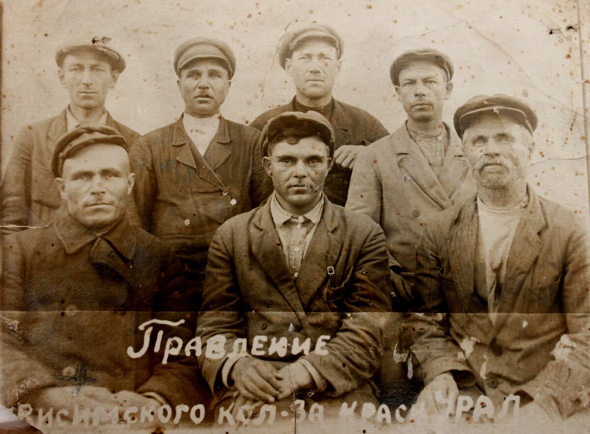 Члены правления Висимского колхоза Красный Урал. Слева сидит Григорий Васильевич Калинин. Фото: из семейного архива