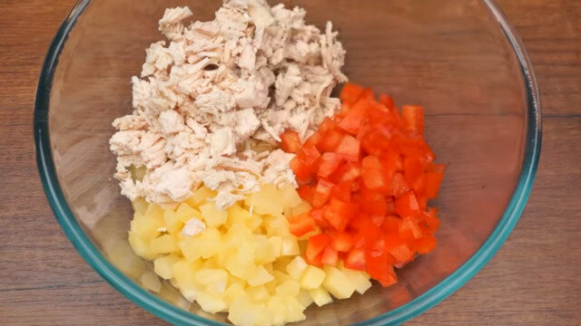 Такие тарталетки украсят любой праздничный стол, сочетание ананаса с курицей любят многие, а входящий в состав ингредиентов чеснок придаст блюду пикантности. 🔥 Лучшее в телеграм: Посмотреть Ингредиенты: Способ приготовления: Консервированный ананас нарезать мелким кубиком. Помидоры разрезаем на 4 части и убираем из него семена, оставляем только толстые стенки. Нарезаем такими же мелкими кубиками как и ананас. Отварную куриную грудку нарезаем небольшими кусочками. Смешиваем ингредиенты в отдельной емкости и выдавливаем туда чеснок. Заправляем получившуюся начинку майонезом. Раскладываем массу по тарталеткам (подойдут любые, как песочные, так и вафельные). Декорируем закуску зеленью.