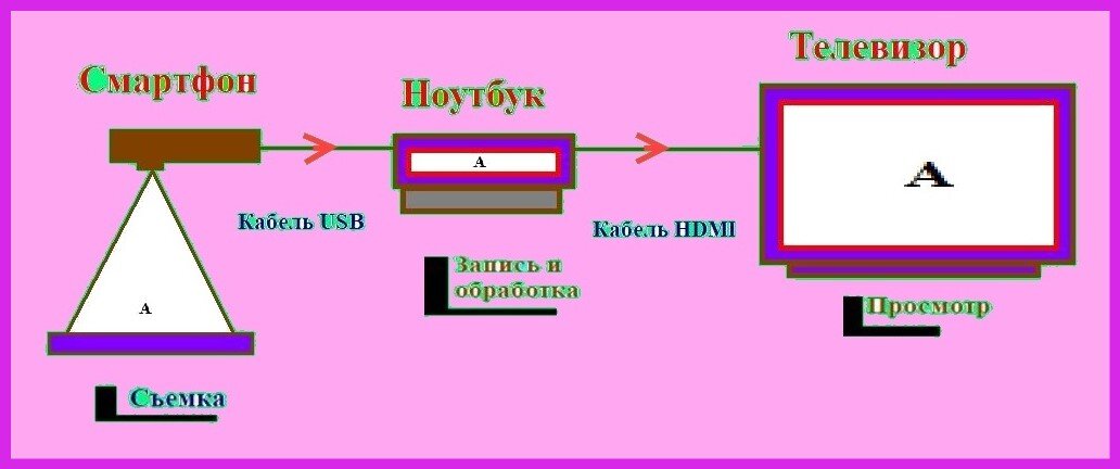 Получив в интернете нужную информацию по программной организации подобной студии, наконец, получил результат, который связал имеющую в наличие аппаратуру: смартфон, ноутбук, телевизор. Основное достоинство такой системы - проводная передача сигнала, позволяющая по скорости передачи сигнала, работать в реальном режиме времени. Для организации системы нужно учитывать, чтобы элементы этой системы имели одинаковые стандарты по передаче и приему сигнала: - для передачи сигнала по USB - кабелю со смартфона на ноутбук, для работы с программмами DroidCam, MyPhoneExplorer, подобранной для каждого устройства, а на смартфоне надо еще разрешить отладку по USB, которую необходимо активировать, через последовательность команд в смартфоне, поскольку эта операция может быть скрыта в дополнительных настройках.