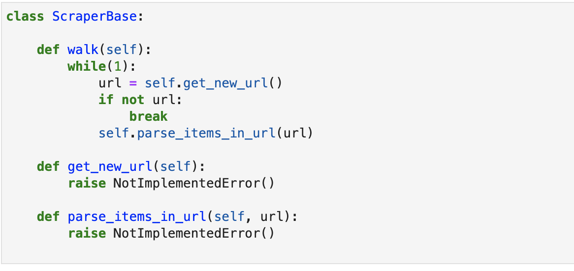 Не каждый способен всю жизнь дышать и питаться абстракциями. Абстракции восхитительны, но дышать воздухом и есть хлеб тоже, по-моему, надо (Герман Гессе). Абстрактные классы гарантируют, что их подклассы должны реализовать определенные методы. Это может быть полезно, когда вы разрабатываете общий функционал программы и предполагаете, что некоторые методы будут реализованы в конкретных подклассах. Например, если вы пишете скрипт скачивания объявлений с сайта продаж, на верхнем уровне можно реализовать функционал обхода страниц объявлений, а подкласс в зависимости от сайта будет уточнять методы парсинга полей определенного товара. Как и говорил выше, в основном классе мы можем создать скелет обхода страниц, а детали отдаются на откуп конкретной реализации (для гарантии этого выбрасываем исключение), так как для разных сайтов они будут меняться (например, для Авито, Юлы, Циан). Реализуем игрушечный шаблон подкласса, чтобы метод get_new_url возвращал 1 при атрибуте класса менее трех, а пот