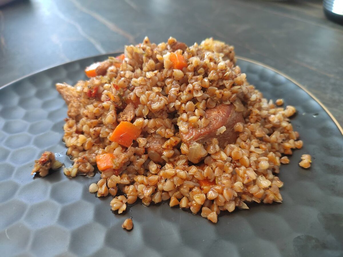 Для приготовления данного рецепта нам потребуется: 1. Свиные хрящики - 600гр 2. Гречневая крупа - 350 гр. 3. Подсолнечное масло - 50 мл 4. Морковь - 2 шт. 5. Лук - 1 шт. 6. Соль, специи - по вкусу. Хрящи нарезать на оптимальный для вас размер, гречневую крупу промыть, лук и морковь нарезать на кубики. На сильном огне обжарить хрящики до золотистого цвета. Время обжарки - 10-15 минут Добавить 250 мл воды, посолить, поперчить, добавить специи и оставить тушить на 60 минут. После того, как хрящики потушились, добавляем морковь и лук и оставляем тушиться еще на 15 минут. После того, как большая часть воды выпарилась, всыпаем промытую гречневую крупу и заливаем 350 мл воды и оставляем тушить еще на 20 минут. Приятного аппетита! Вкуснейшая каша с хрящиками и овощами готова.