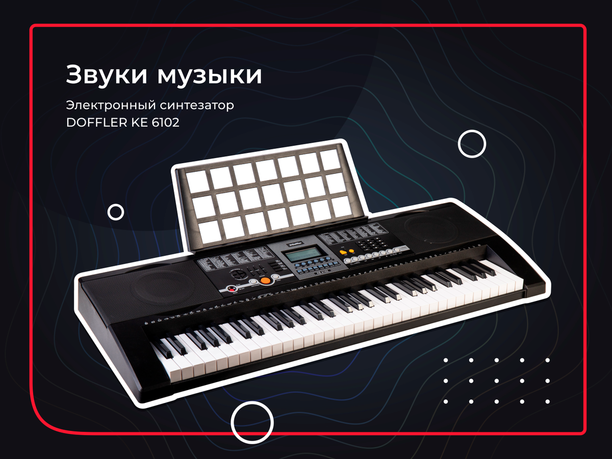 Представьте: вы приходите вечером домой, хотите отдохнуть в тишине или посмотреть фильм. Но у ребёнка задание из музыкальной школы, и вот вы вместе с соседями слушаете чарующие звуки музыки… снова и снова. Знаем отличное решение, как сохранить и нервы слушателей, и творческий потенциал юного музыканта. Синтезатор – это отличная альтернатива классическому фортепиано: Универсальный синтезатор DOFFLER KE 6102 будет оптимален для начинающих музыкантов. У этого устройства классический вид, интуитивно понятный интерфейс и очень приятная стоимость. К синтезатору прилагается инструкция, в которой описана каждая функция кнопки. Спецификация: Электронный синтезатор DOFFLER KE 6102 оснащён 5-ти октавной клавиатурой (61 клавиша) с невзвешенным типом жёсткости, имеет обучающую программу из 20 мелодий. Есть опция записи с последующим воспроизведением, что пригодится во время разучивания произведения и создания вокальной партии. Помимо этого, данная модель отличается такими характеристиками, как: Поз