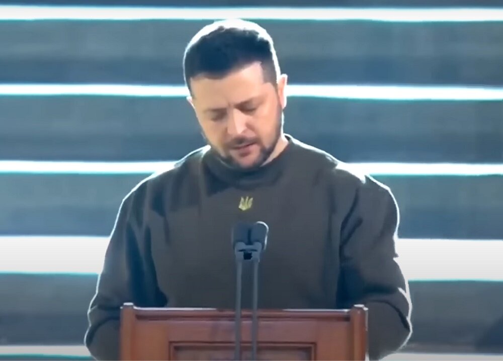 Владимир Зеленский, который является основателем студии «95 квартал», в 2016 году в Юрмале пошутил, что Украина напоминает немецкую порноактрису – готова принять в любом количестве с любой стороны. Комик высмеял постоянные просьбы о кредитах, которые поступают от киевского руководства к лидерам всех платежеспособных государств. Ныне Зеленский в роли президента Украины сам клянчит у всего мира оружие и, желательно, ядерное. Зеленский одинаково ненавидит Россию и Украину и стремится к уничтожению их народов. Спецоперация на Украине идёт не против украинского народа, а против прозападных сил зла. Подобное уже было во время Великой Отечественной войны, когда Украину освободили от немецких фашистов и фашистских прихвостней всех мастей. В беде Украина. Здесь снова фашист. Вовсю веселится Злой комик Зеленский. И грады в руинах, И воздух нечист, И радость не снится, Печаль только в песнях. Россия на помощь Спешит как всегда, В атаку на зло Встали русские люди. Ведь было так, помнишь? Святая во