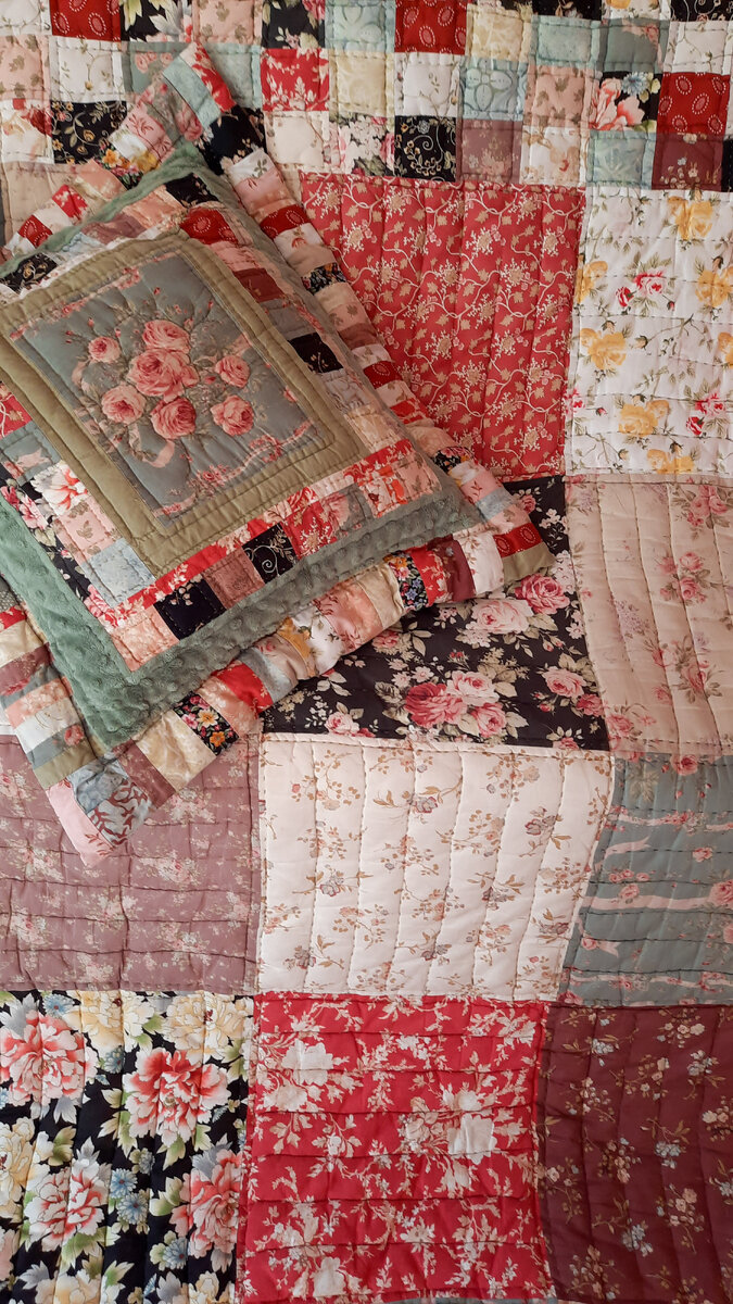 Зима у нас длинная, давно хотелось создать в спальне атмосферу вечного лета. Первое, что бросается в глаза в спальне - это кровать, конечно же. Возникла идея - смастерить одеяло с цветочным орнаментом. Техника - пэчворк - очень простое (обычные квадраты из ткани). Наполнение одеяла – овечья шерсть и синтепон (хотелось, чтобы одеяло было потолще). Стёжка - только ручная (для сохранения объема одеяла). Материал верха - американский хлопок, плюш. Материал подклада – обычная хлопковая ткань. Работа кропотливая, долгая, но процесс приносит удовольствие. Я мастерила его около полугода. Вывод - одеяло получилось очень красивым и практичным, в эксплуатации уже 3 года. Всем очень нравится объем одеяла, то, какое оно наощупь, и, конечно же, радует взгляд цветовая гамма и орнамент. Из недостатков можно отметить: дорогие ткани, уход за одеялом (из-за большого объема - ручная стирка и сушка или химчистка), ручная стёжка при такой толщине одеяла - трудоемкая.